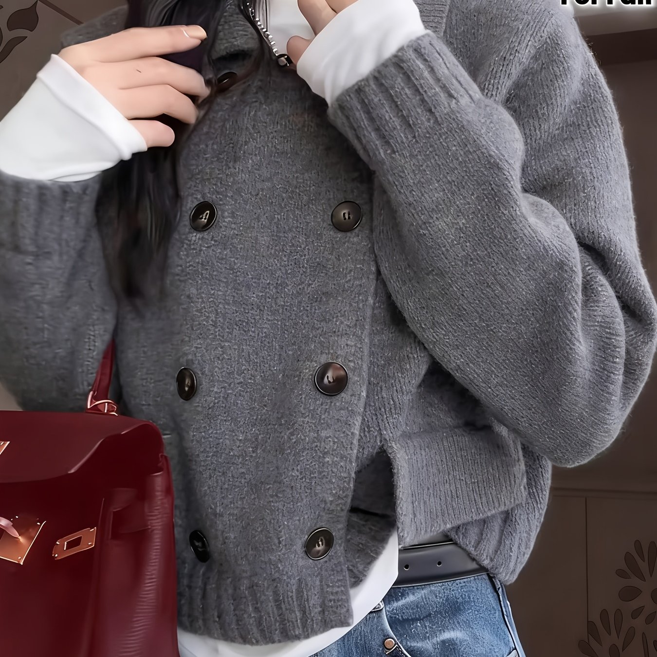 TEMU 여성을 위한 독특한 빈티지 고품질 숏 가디건. 심플한 회색 컬러의 더블 브레스트 디자인으로, 가을 착용에 완벽하며, 캐주얼, 포멀한 행사, 또는 여행에 적합합니다.|가디건|반팔니트