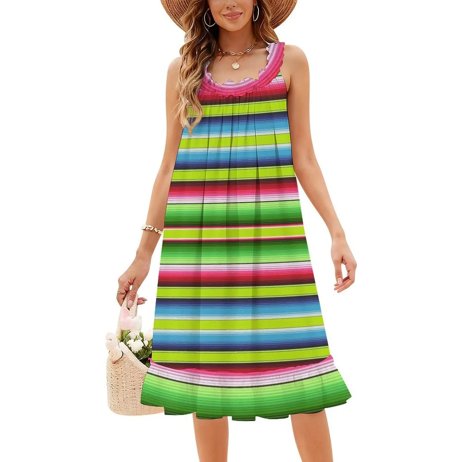 라임 그린 멕시칸 세라페 블랭킷 스트라이프 여성용 우아한 파티 드레스 A라인 드레스 (짧은/긴/소매 없는 옵션) 멕시코 스타일