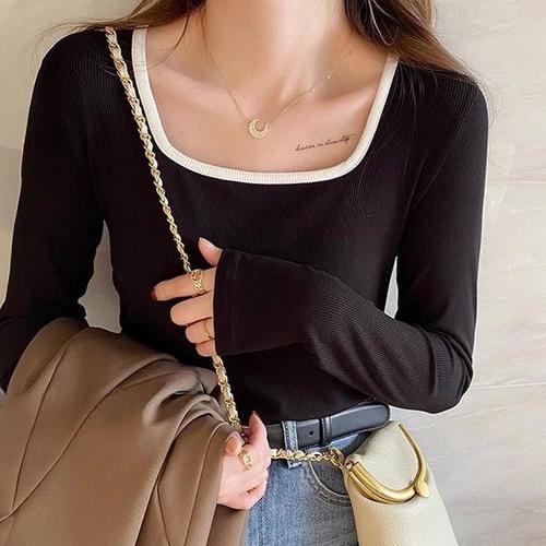 구디프 여성용 U넥 슬림핏 긴팔 데일리 기본 티셔츠