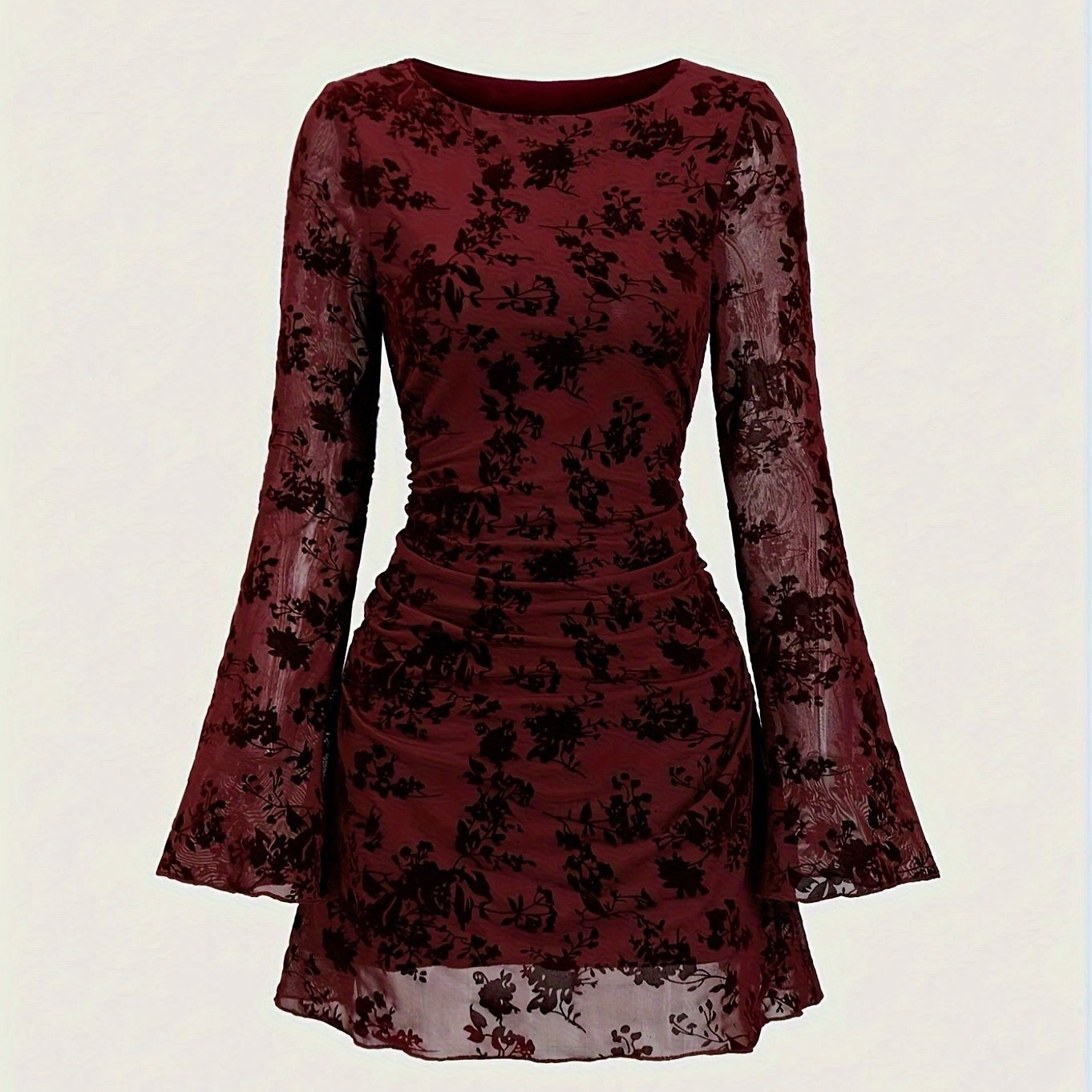 TEMU 여성용 우아한 빈티지 미니 드레스 - 튤 & 네트 벨 소매, 솔리드 컬러 라운드 넥 숏 티셔츠 탑, 기계 세탁 가능 가을/겨울 웨딩 게스트 드레스, 슬림핏 미니 길이 파티 & 특별한 날을 위한 우아한 스페셜 라인