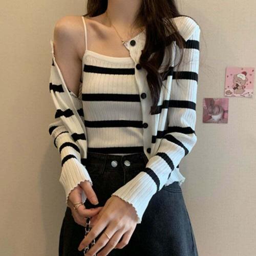 [셀럽하우스]여성 RYXD7760 배색 단가라 골지 나시 니트 가디건 세트