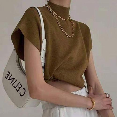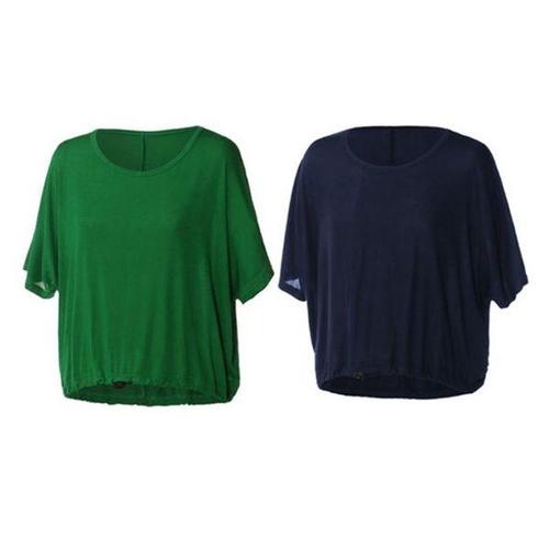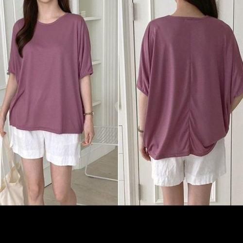 WANGBAIWAN 여성 얇은 단색 라운드넥 반팔티셔츠 루즈핏 밑단 밴딩 가오리핏 블라우스 캐주얼 S63010
