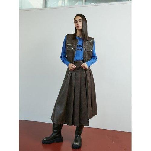 [미라클세븐]여성 가을 펀칭 플레어 가죽 롱스커트 밴딩
