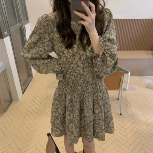 [다잇템]여자 봄 가을 간절기 플라워 스모크밴딩 긴팔 미니원피스