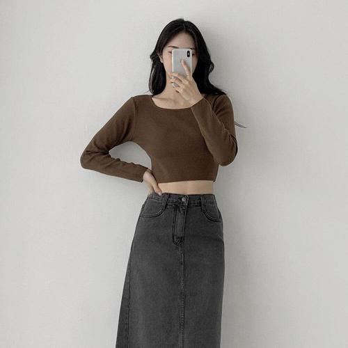 [신상오픈런]여성 크롭 긴팔 티셔츠 스퀘어넥 기본 무지 잔골지 니트 가을용