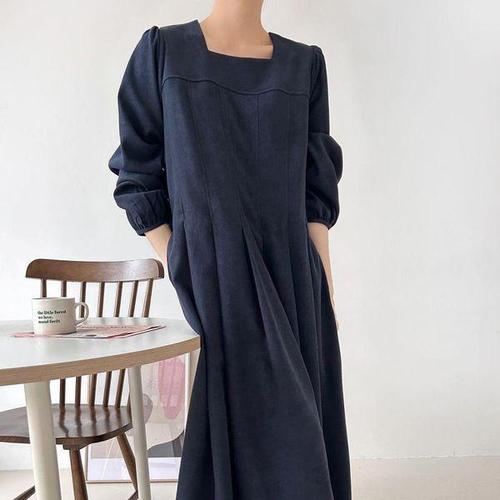 [신상오픈런]여성 스퀘어넥 롱원피스 가을 하객룩 핀턱 플리츠 포켓 디자인