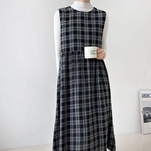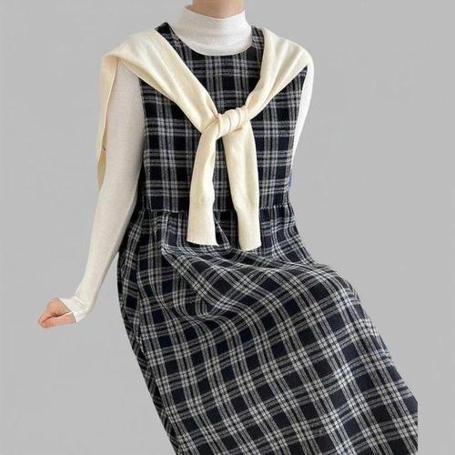 [신상오픈런]여성용 체크 롱원피스 가을 스타일 민소매 속기모