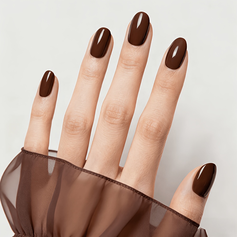 TEMU 수제 인조 손톱 10개 세트 - 중간 크기의 타원형 모양, 반짝이는 끝이 있는 핫 초콜릿 색상, 다양한 스타일에 적합하며 영구적인 스타일, 가을 및 겨울, 크리스마스 및 새해 네일 장식, 축제 선물로 이상적