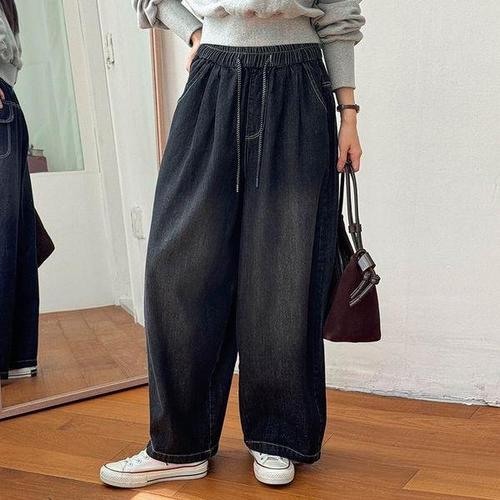 [다잇템_패션]여자 워싱 넓은 그런지 고무줄 남자 진 청바지