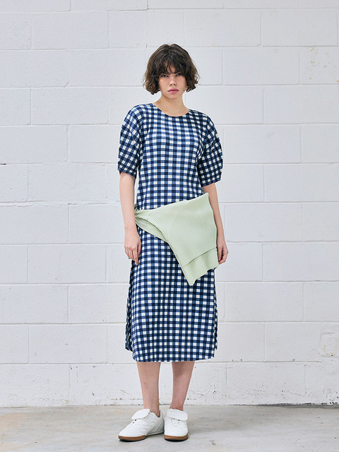 [와이오와이] 고방 체크 반팔 플리츠 롱 원피스_네이비