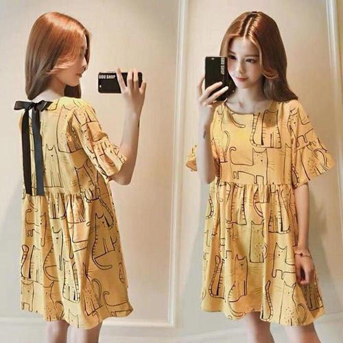 [모노무드]모노무드 xmfl-2 여성 여름 원피스 리본 캣 루즈핏 고양이 프린팅