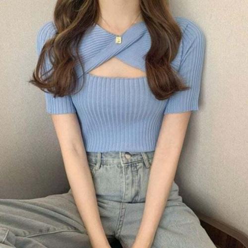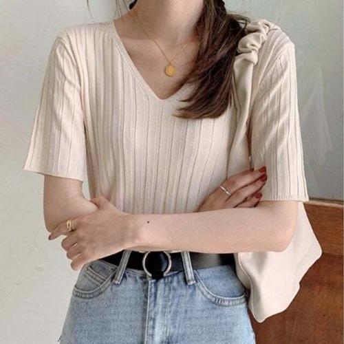 [셀럽하우스]골지 YCQQ3092 브이넥 캐주얼 니트 반팔티 필수템 여름