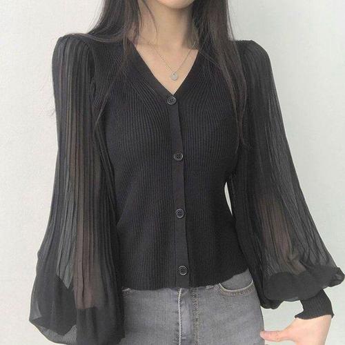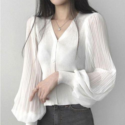 [에이치플러스몰]퍼프 플리츠 여성 브이넥 골지 블라우스 가디건