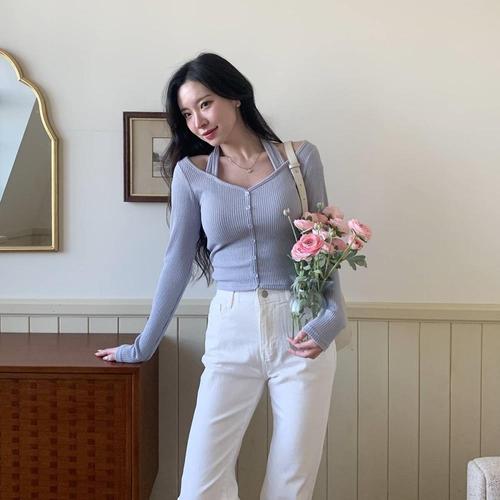 [옷자락] 여성 브이넥 페이크 단추 홀터넥 슬림핏 골지 긴팔티