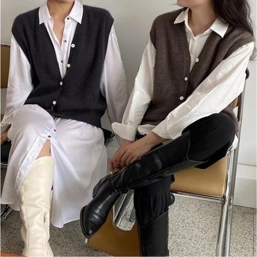 맵시난다 여성 레이어드 상의 블라우스 브이넥 투인원 카라 니트 조끼 셔츠 U24
