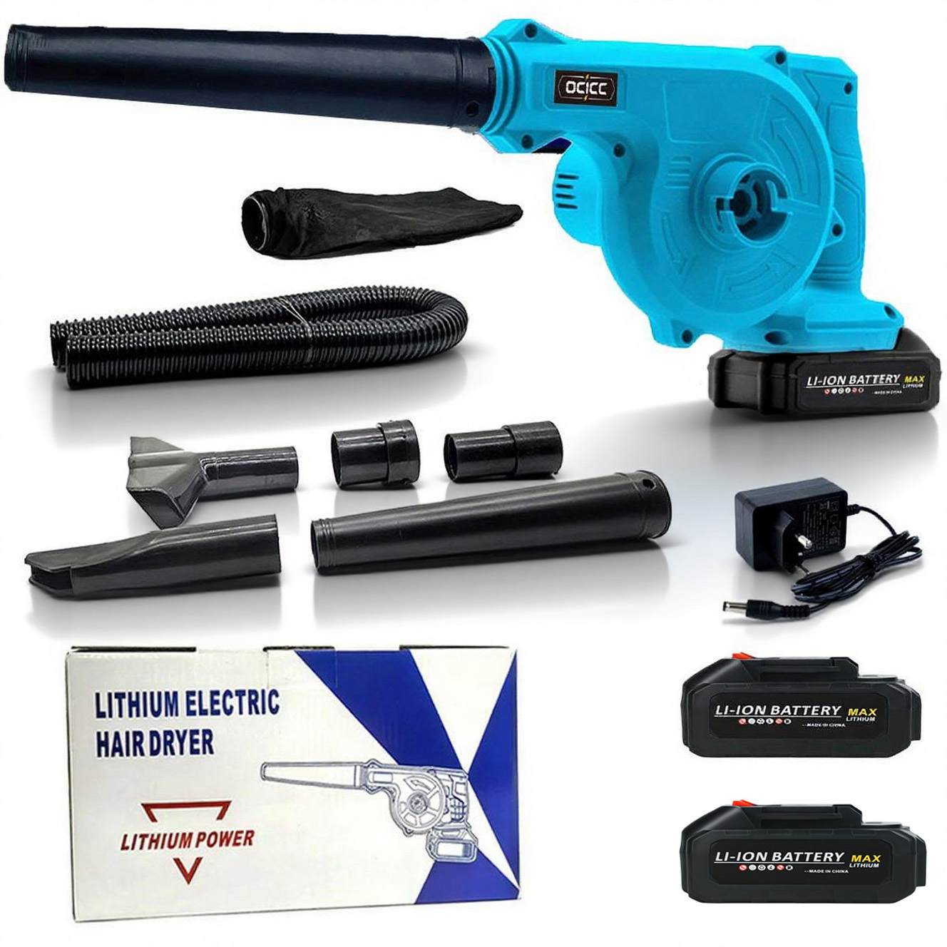 TEMU ocicc 충전식 리튬이온 고출력 송풍기, 본품 + 배터리2개 무선 헤어 드라이어 진공 콤보 4-in-1 제설 낙엽 청소기,캠핑 세차 전동 브로워 블로워풀세트