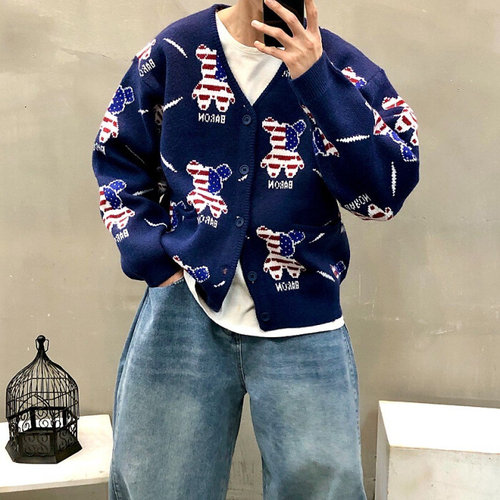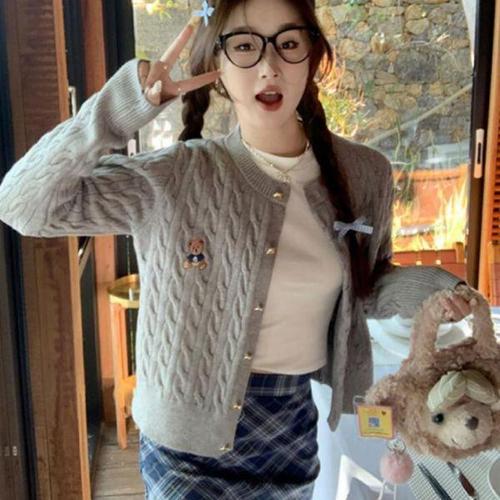 Vezri 여성용 봄 가을 캐주얼 귀여운 곰돌이 장식 니트 가디건 F88