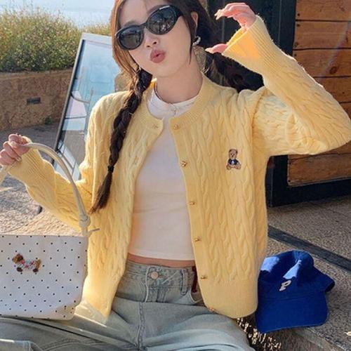 [에이치플러스몰]여성 꽈배기 곰돌이 자수 금장단추 라운드넥 가디건 4색