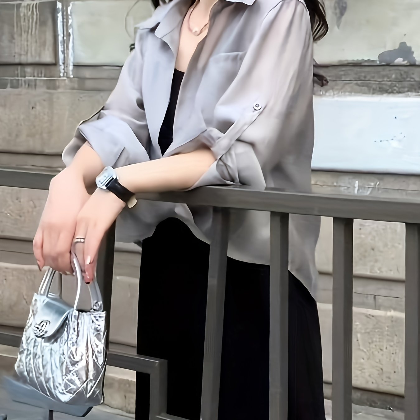 TEMU 여성용 2025 여름 휴가 시크 롱 슬리브 셔츠 - 가벼운 루즈핏 칼라 블라우스 포켓, 반투명 솔리드 컬러 비치 아웃핑 & 캐주얼 웨어, 해변 의류, 세련된 룩, 고품질 원단