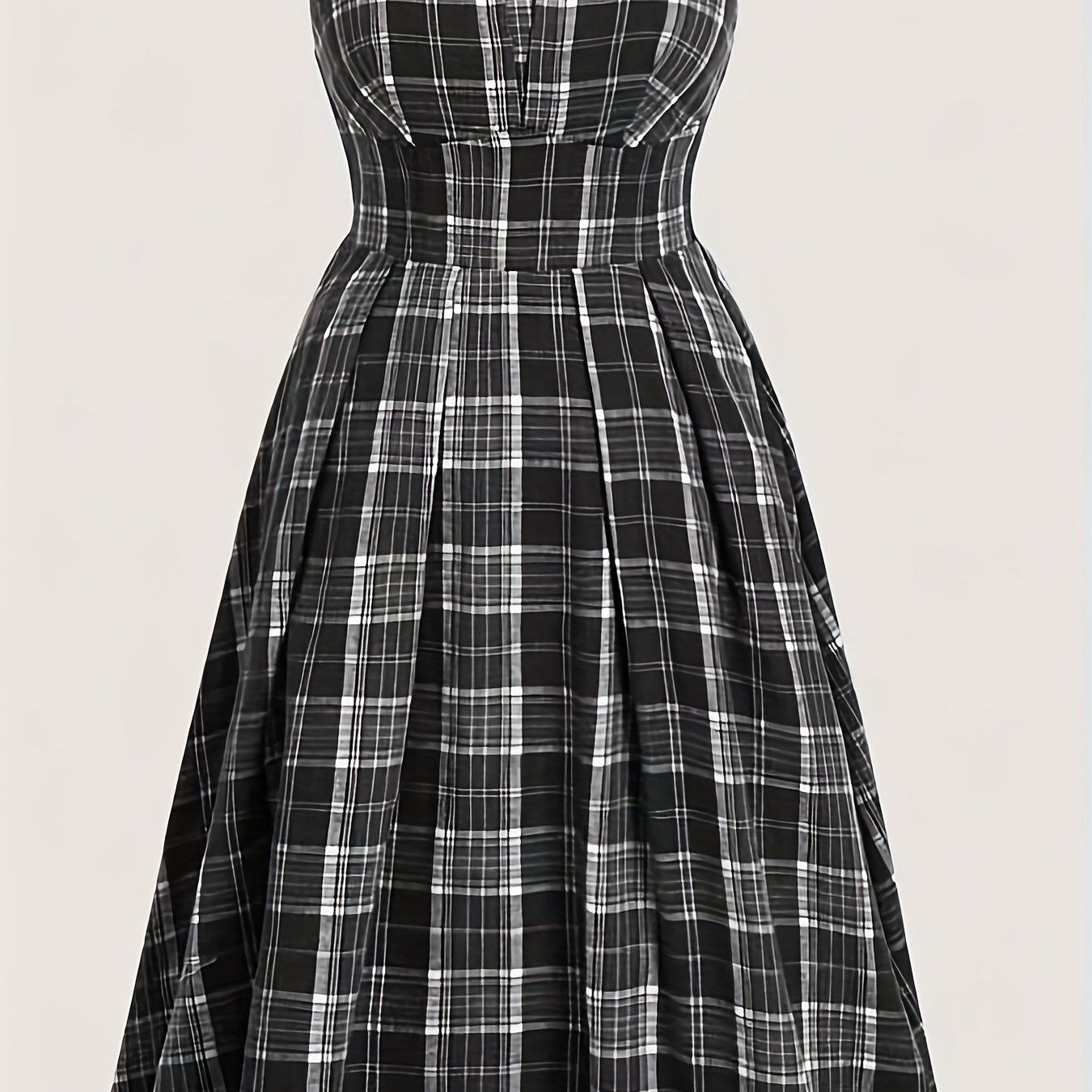 TEMU 유럽과 미국의 여성들이 아름답고 유행하는 체크무늬 오프숄더 스파게티 스트랩 드레스를 착용합니다.
