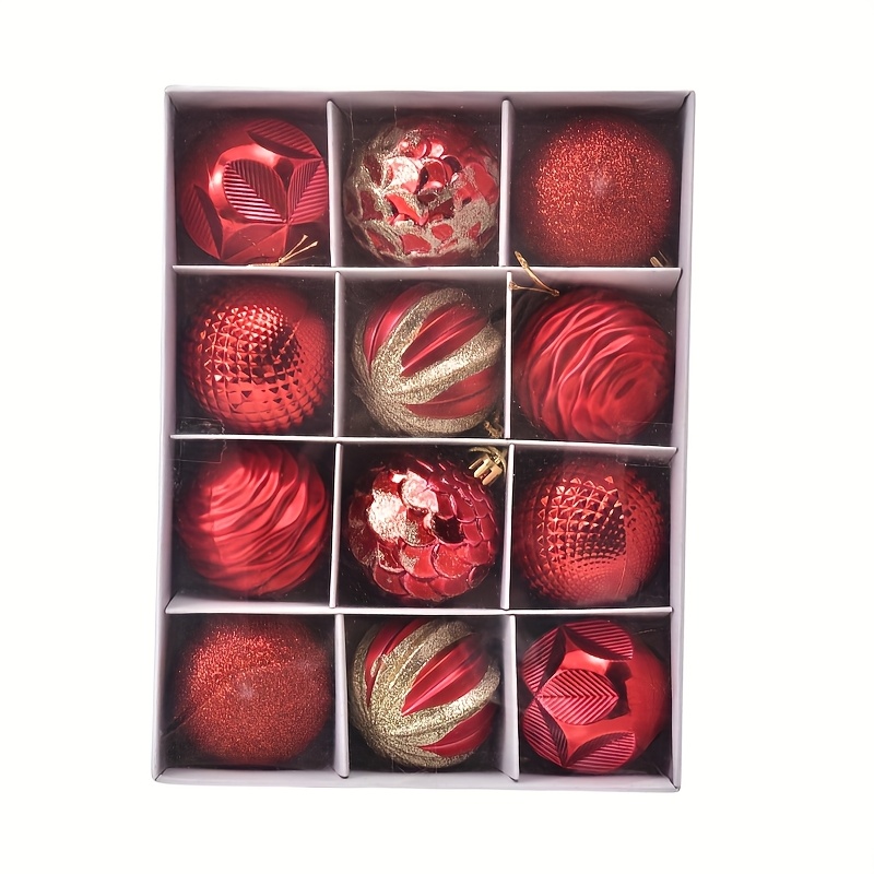 TEMU 12pcs 글램 스타일 크리스마스 장식 세트 - 6cm 레드와 골든 라운드 행잉 장식, 플라스틱, 배터리 필요 없음, 박스 포함으로 쉽게 설정할 수 있는 크리스마스 장식 장식