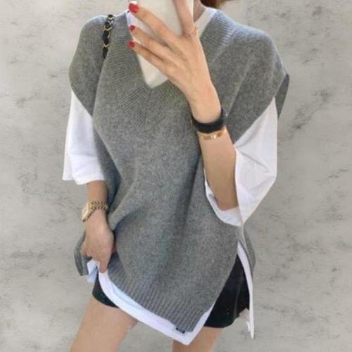 [옷자락]여성 키치무드 그레이 블랙 브이넥 사이드 슬릿 니트 베스트