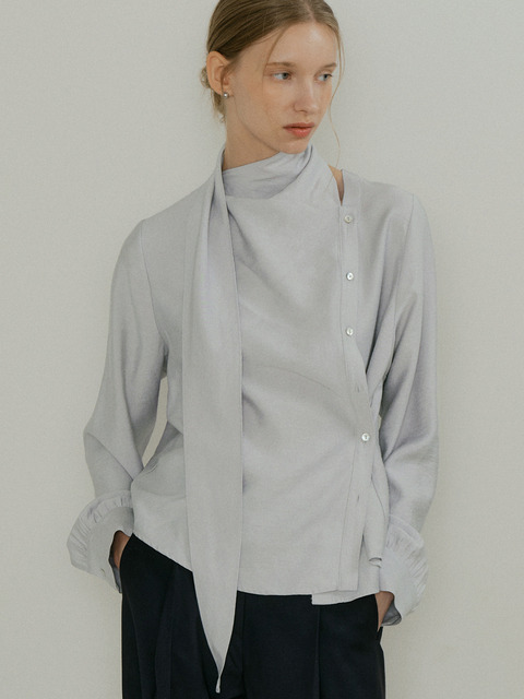 [아워코모스] 스카프 넥 사선 블라우스 펄 그레이
