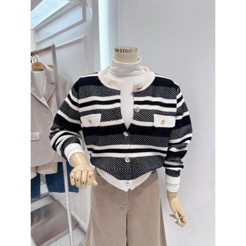 [신상오픈런]|CSJ6784|여성 부클 울 니트 금장 버튼 스트라이프 라운드형 가을 가디건_22934283_597559