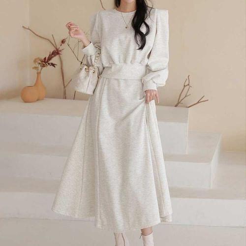 [에이치플러스몰]프릴 맨투맨티 밴딩 롱 스커트 세트 기모 데이트룩