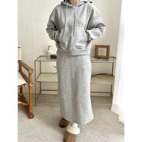 [샵앤]국산 여성 기모 후드 티셔츠 롱스커트 셋업 LL-WSET-5008-멜란지