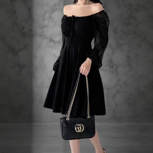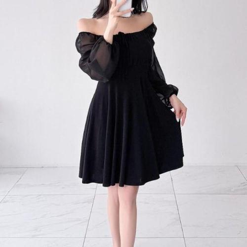 [신상오픈런]여성 오프숄더 쉬폰 소매 프레어 긴팔 미디 원피스
