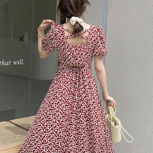 [에이치플러스몰]앵두 패턴 여성 A라인 여름 반팔 롱 원피스 데이트룩