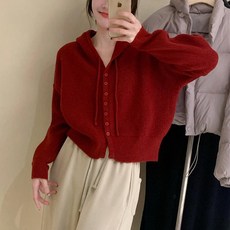 cammello 스트링 후드 루즈핏 긴팔 니트 가디건 세미 크롭가디건