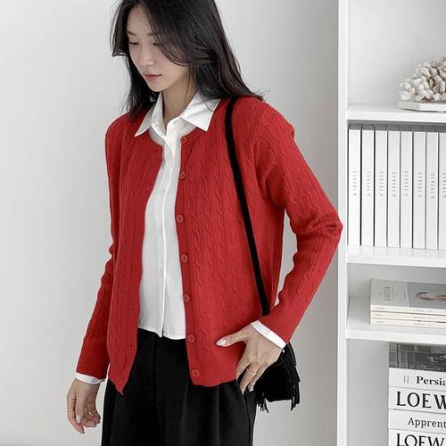 [신상오픈런]여성용 빨간색 라운드 니트 꽈배기 가디건 가을 데일리룩 (40818190)