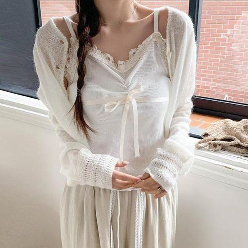 [옷자락]여자 페미닌 데이트룩 레이스 리본 골지 슬림 끈나시