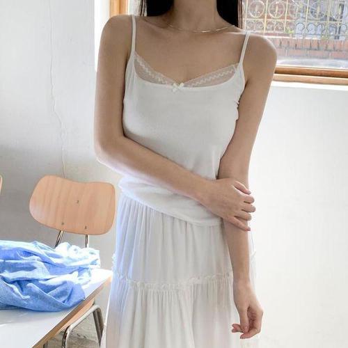 [옷자락] 여자 페미닌 데이트룩 레이스 리본 골지 슬림 끈나시