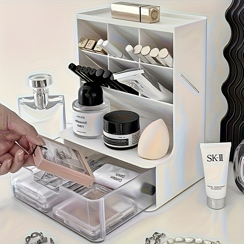 TEMU 다용도 메이크업 정리함 (서랍 포함) - 브러쉬, 립스틱, 아이섀도우 및 제품 보관에 적합 - 5가지 장면 사용에 적합 - 가벼운 플라스틱 메이크업 테이블 수납 솔루션, 메이크업 브러쉬 홀더, 향수 정리함