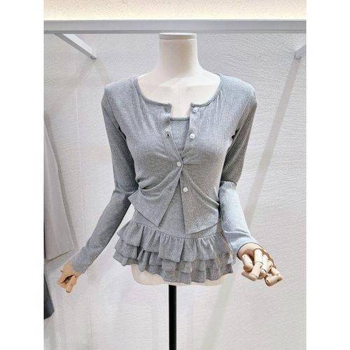 [잇수다] (SET) 루빈나 리본 스트랩 루즈핏 니트 가디건 + 프릴 캉캉 나시 세트