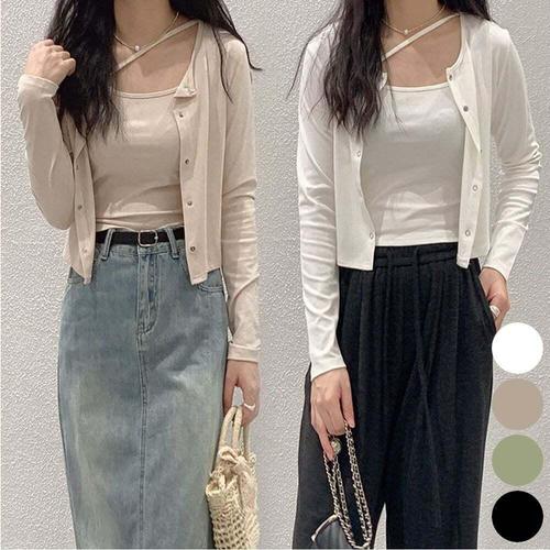 [셀럽하우스]긴팔 ZSYM7287 크롭 가디건 세트 여성 버튼 이너 민소매 나시