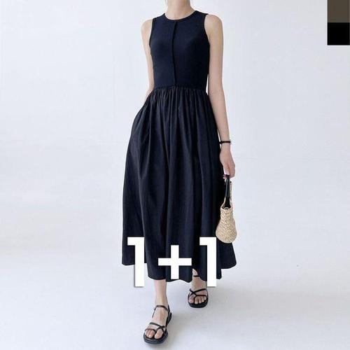 플레어 레이어드 민소매 라운드넥 롱원피스