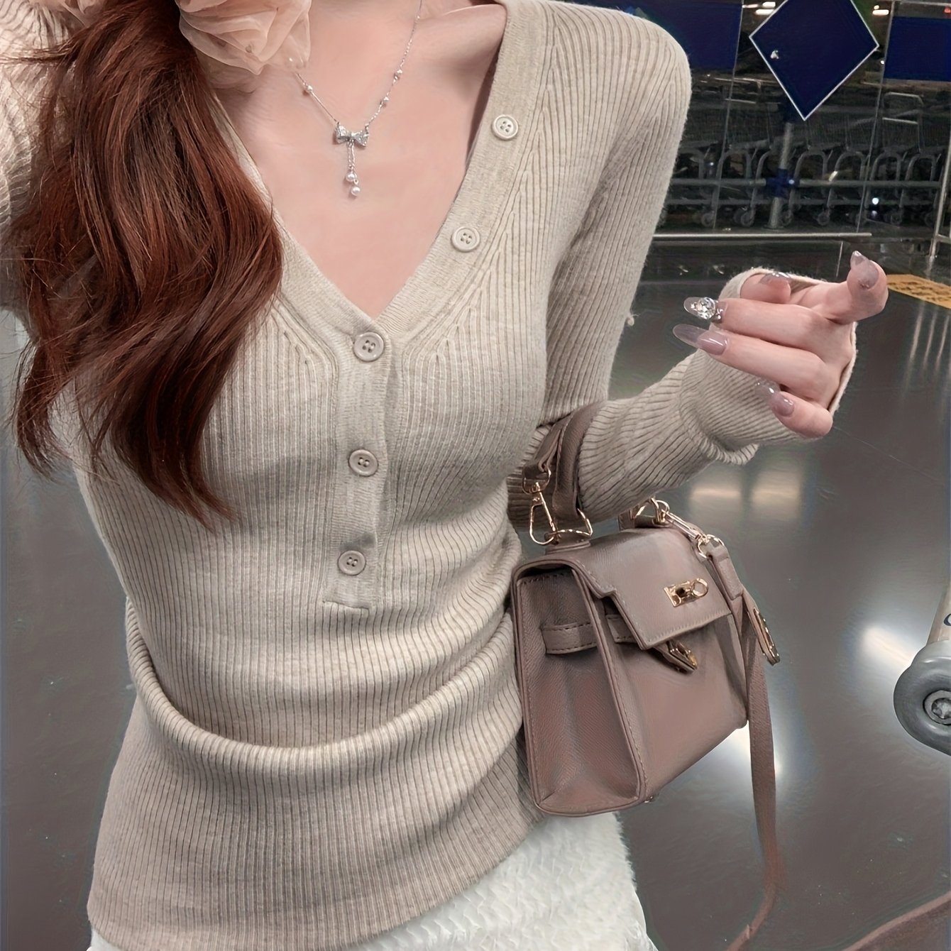 TEMU V넥, 버튼 디테일, 신축성 있는 핏감으로 몸매를 강조하는 여성용 봄 캐주얼 탑, 활용도 높은 단색 긴팔 셔츠