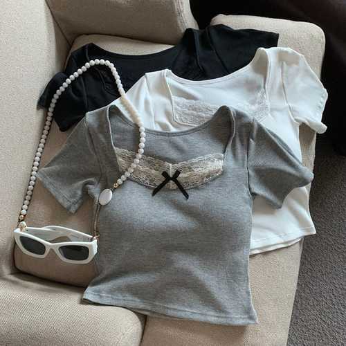 슈팅스타 / 키치 리본 매듭 레이스 U넥 크롭 숏 반소매 크롭티