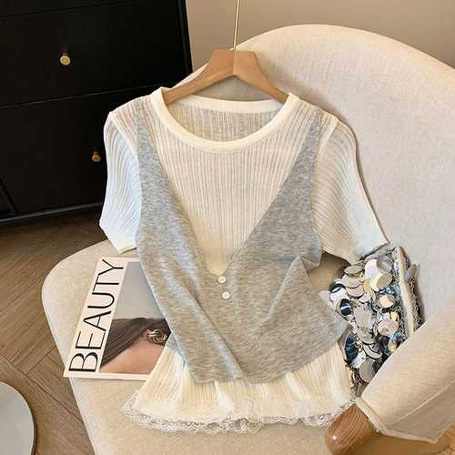 슈팅스타 / 반팔 니트 레이스 레이어드 뷔스티에 티셔츠