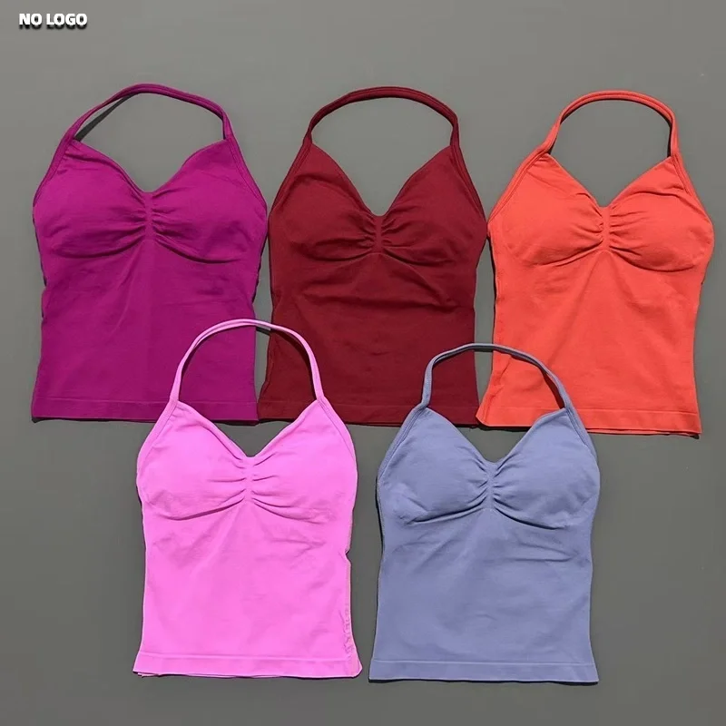 히스텔로 스포츠 롱라인 스트래피 탑 여성용 심리스 요가 베스트 탈부착 패드 백리스 피트니스 탱크탑 짐 운동 홀터
