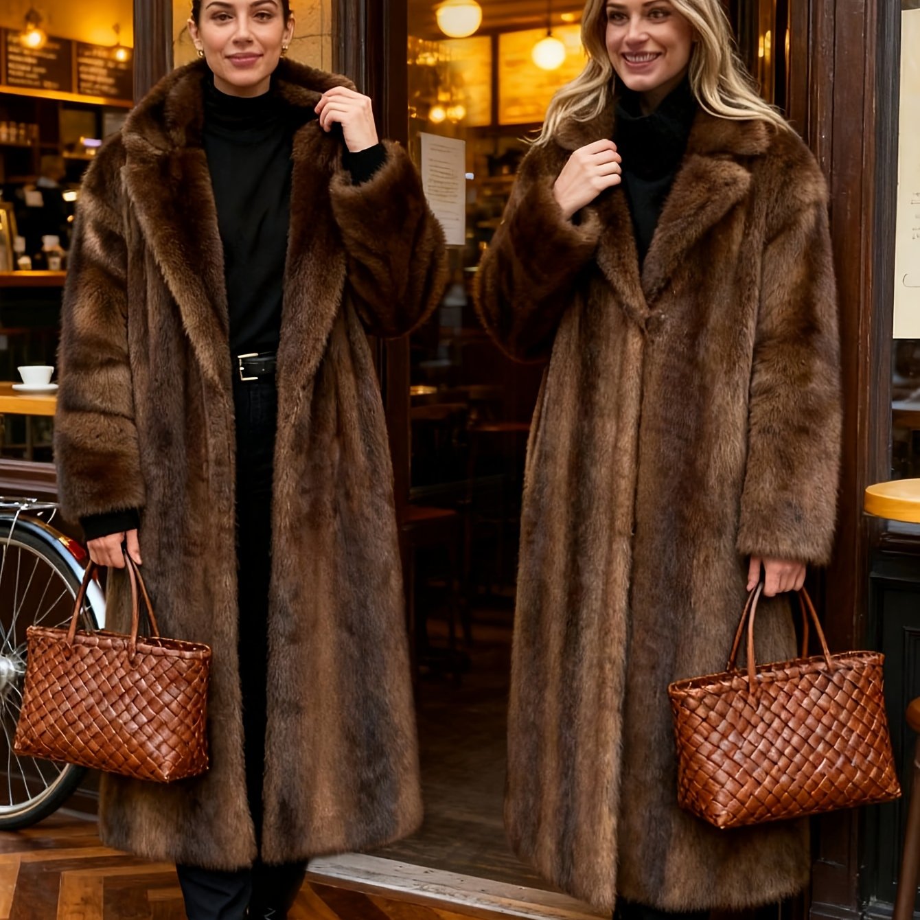 여성용 다크 다크 브라운 인조 모피 롱 오버코트, 싱글 브레스트 플리스 재킷, 트렌치 코트, 푹신한 플러시 따뜻한 코트, 2023 겨울 신상
