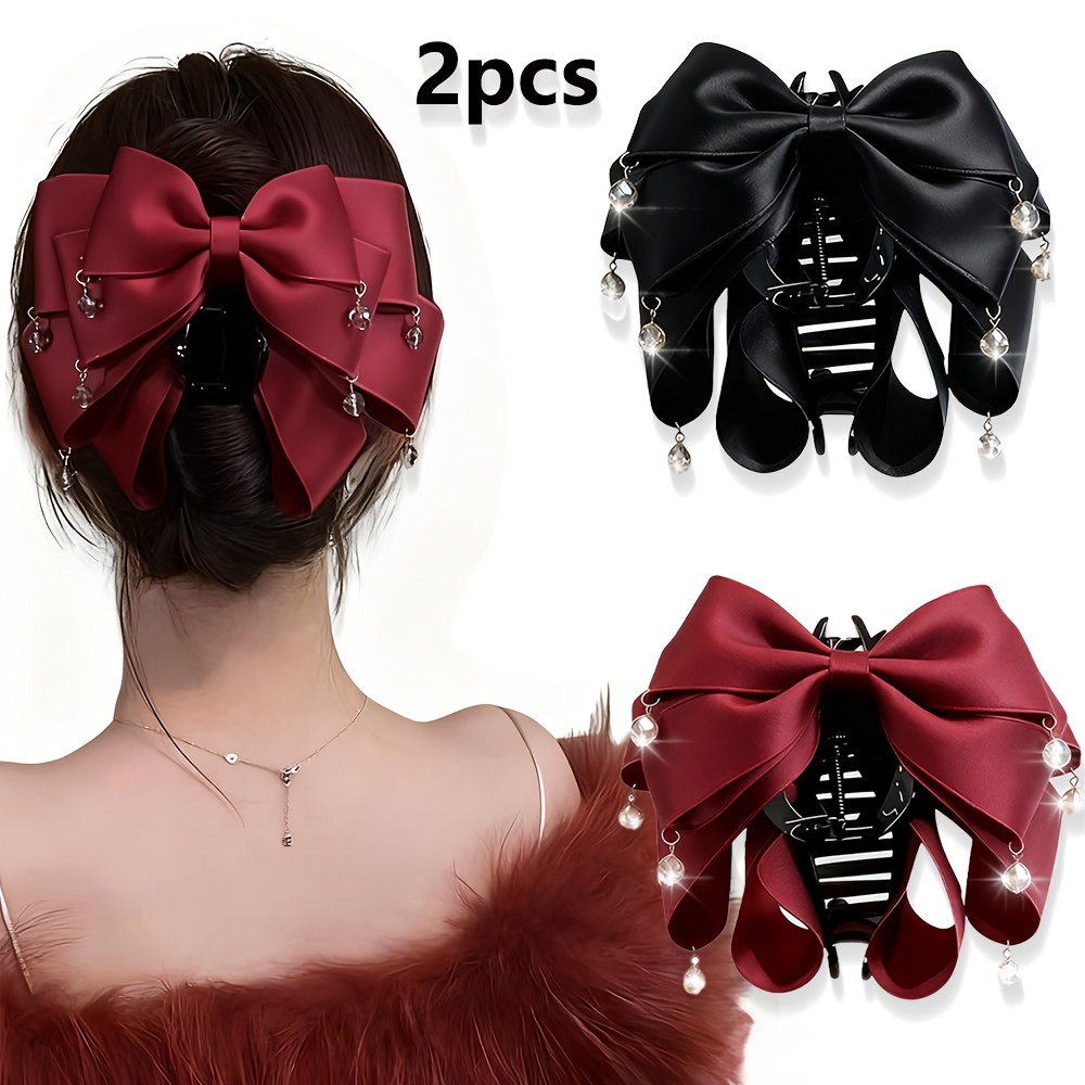 TEMU 2개 세트 새로운 멀티 레이어 패브릭 리본 아크릴 헤어 클립, 여성 패션 태슬 펜던트 대형 헤어 클립, 미끄럼 방지 샤크 클립, 두꺼운 머리카락에 적합, 여성 헤어 액세서리