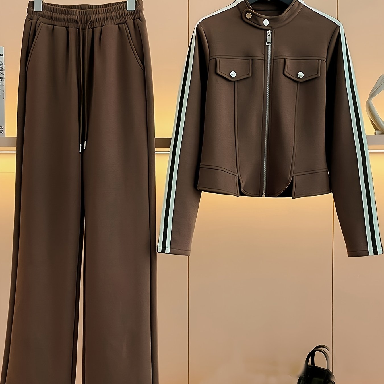 TEMU 여성용 고급 패션 세트, 2026년 신상 가을 신상 고급스러운 자태 지퍼 재킷 사이드 와이드 레그 팬츠 투피스 세트, 여성 캐주얼 패션 스웨트셔츠 루즈핏 롱 팬츠, 데일리 스트리트 출퇴근 캐주얼 팬츠 세트
