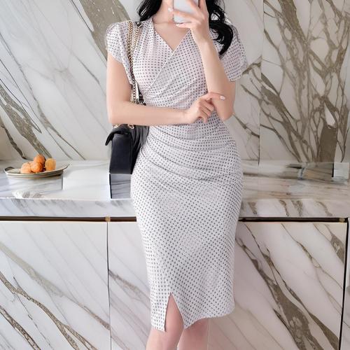 [다잇템]여성 V넥 중간 날개소매 잔주름 랩 원피스
