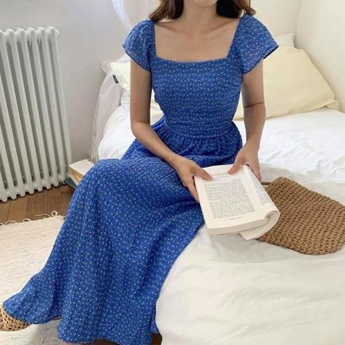 여자 바캉스 날개소매 프릴 스퀘어넥 롱 원피스