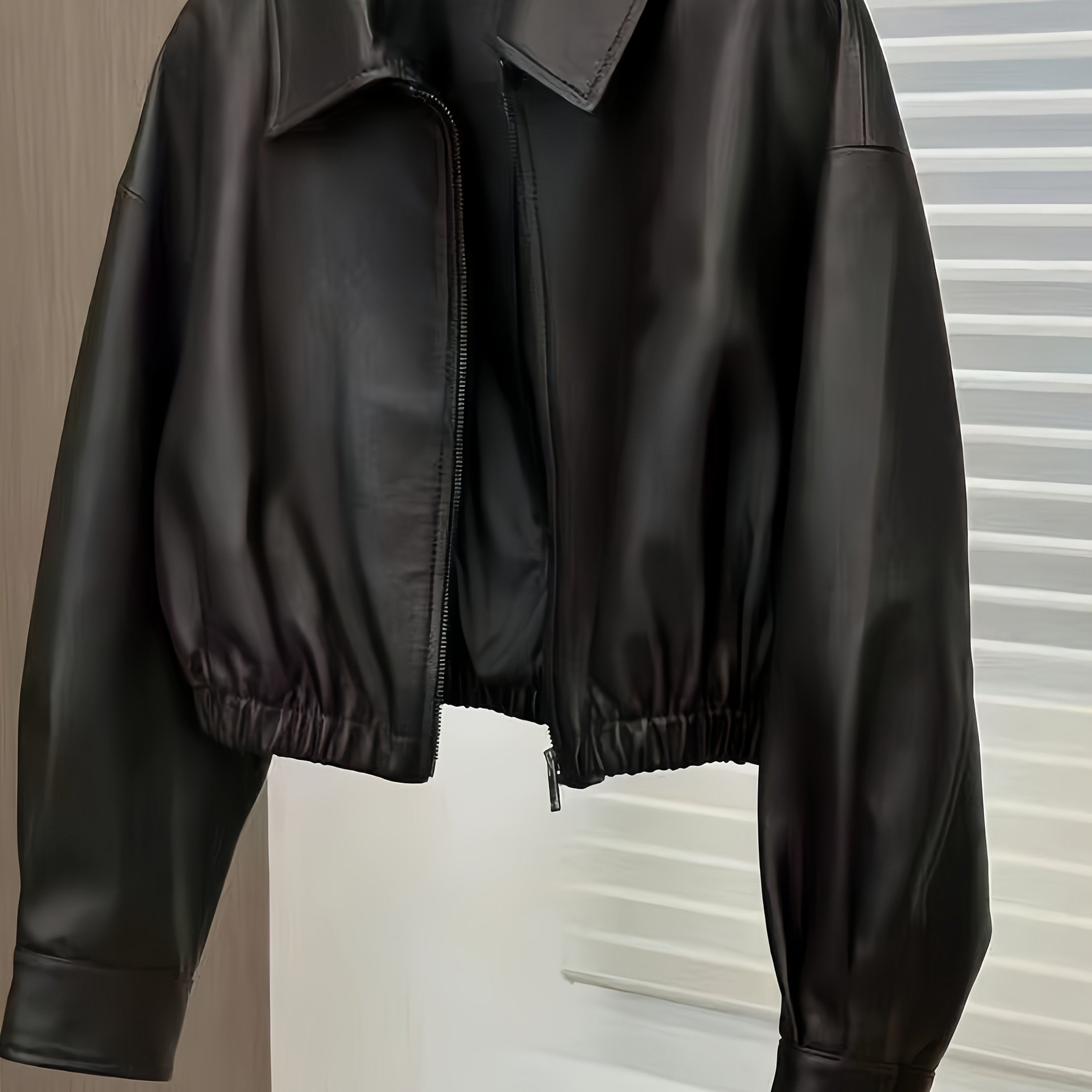TEMU 2025년 가을 블랙 인조 가죽 재킷, 디자인 감각의 지퍼 숏 인조 가죽 재킷